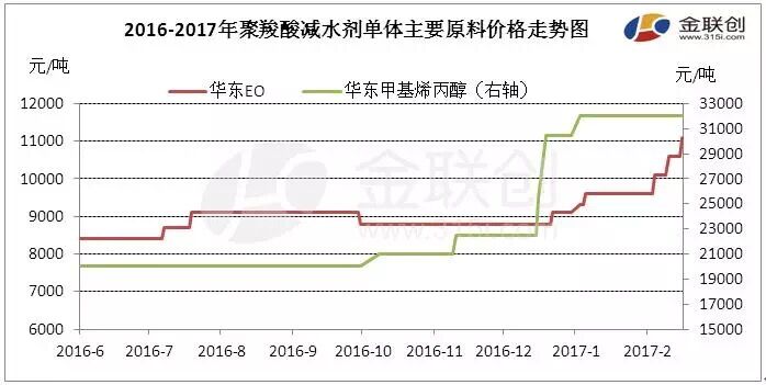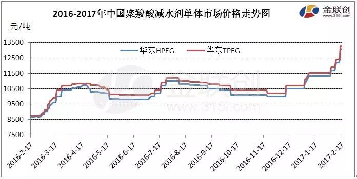 由上圖可見,進(jìn)入2017年以來我國聚羧酸減水劑單體市場價格連續(xù)攀漲,整體漲幅達(dá)2600元/噸。截至今日收盤,聚羧酸減水劑單體市場華東地區(qū)TPEG報盤參考13200-13400元/噸,HPEG參考13000-13200元/噸;東北地區(qū)TPEG出廠報盤參考12700-13000元/噸,HPEG報盤參考12500-12800元/噸,實單成交商談讓利空間有限。